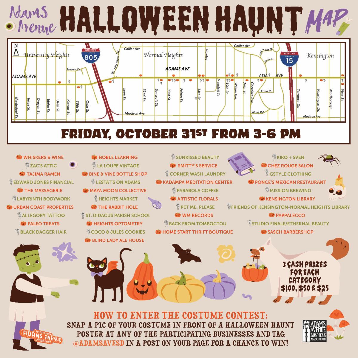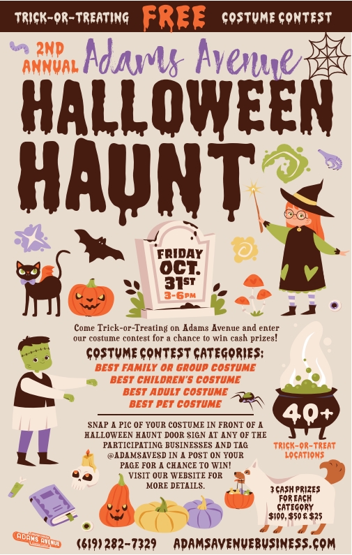 | Start your trick-or-treating early! Adams Avenue Halloween Haunt is on Halloween, Friday, October 31, from 3 – 6pm! The Halloween Haunt is a free event for trick-or-treating at 40 participating business locations and includes a costume contest with cash prizes! To enter the costume contest revelers must take their photos in front of a Halloween Haunt poster and tag AABA’s Instagram account. There will be 4 costume contest categories: best family or group costumes, best children’s costume, best adult costume and best pet costume. First, second and third prizes in each category are $100, $50 & $25. For more information go to Halloween Haunt. Thank you, AABA |